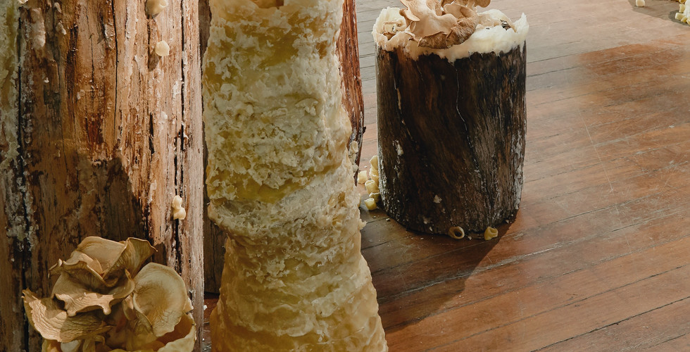 Within and Without is an installation of beeswax and log sculptures which incorporates growing and dried oyster mushrooms (Pleurotus ostreatus) into a larger temporal and corporeal experience. This work invites embodied encounters with these materials, engaging not just the mind but also the body through touch, smell, and movement as well as sight, moving around and within the work. The experience is multisensual: tactile, visual, aromatic, and kinaesthetic. Through these encounters, Within and Without conjures moments of enchantment and reveals processes of time, change, growth, and decay.
